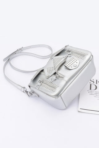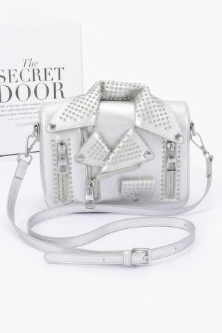 Channel edgy glamour with the Faux Leather Metal Studded Jacket Clutch. Inspired by statement outerwear, this clutch features bold studded detailing on smooth faux leather. Compact and stylish, it’s the perfect piece to add a rock-chic twist to any look.