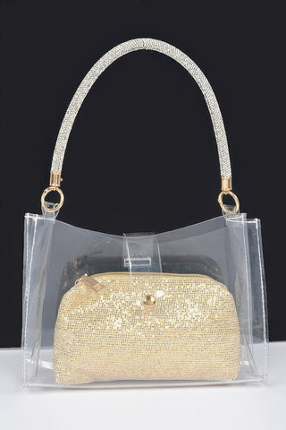 Modern and eye-catching, the Clear Small Hobo Bag with Rhinestone Handle adds a bold twist to any look. Crafted from transparent PVC, this structured hobo-style bag is elevated by a dazzling rhinestone-encrusted handle that brings instant glamour. Its compact size makes it ideal for carrying essentials while keeping your outfit light and stylish. Perfect for events, nights out, or statement everyday wear, this bag blends contemporary design with elegant sparkle in one standout piece.