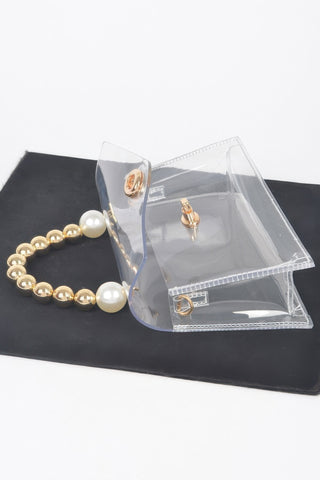 Make a chic and modern statement with the Transparent CCB Handle Flap Clutch, a unique accessory designed to turn heads. Crafted from clear PVC and accented with elegant beads and pearls, this clutch brings together transparency and embellishment in perfect harmony. The standout CCB handle adds a sculptural touch, while the structured flap closure keeps your essentials secure. Compact and eye-catching, it's ideal for weddings, evening events, or elevating a minimalist ensemble with a pop of glam.