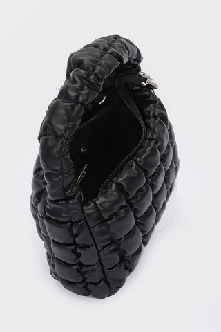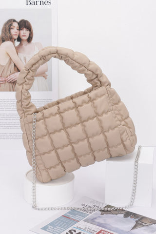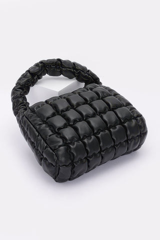 Refined and compact, the Quilted Faux Leather Padded Handle Bag offers a chic solution for carrying your daily essentials. Designed with a luxe quilted finish and structured shape, this stylish accessory is as functional as it is fashionable. Measuring 9” wide by 6” high with a 3” depth, it features a padded top handle and a sleek chain strap for versatile carrying options. Crafted from durable polyurethane and accented with mixed metal hardware, it includes a designated space for slim items like a small tablet or magazine. Perfect for on-the-go days or evening outings, this bag brings a polished edge to every look.