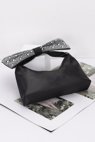 Graceful and glamorous, the Rhinestone Hotfix Bow Handle Nylon Clutch is designed to make a dazzling impression. Featuring a shimmering rhinestone-encrusted bow handle and a smooth satin-like nylon finish, this clutch offers a luxurious look with a playful twist. Measuring 9” wide by 5.5” high with a 2.5” depth, it’s perfectly sized to hold your evening essentials while maintaining a sleek, sophisticated profile. Crafted from durable polyurethane with mixed metal accents, it balances elegance and durability effortlessly. Ideal for weddings, galas, or a night out, this clutch adds a radiant touch to any ensemble.