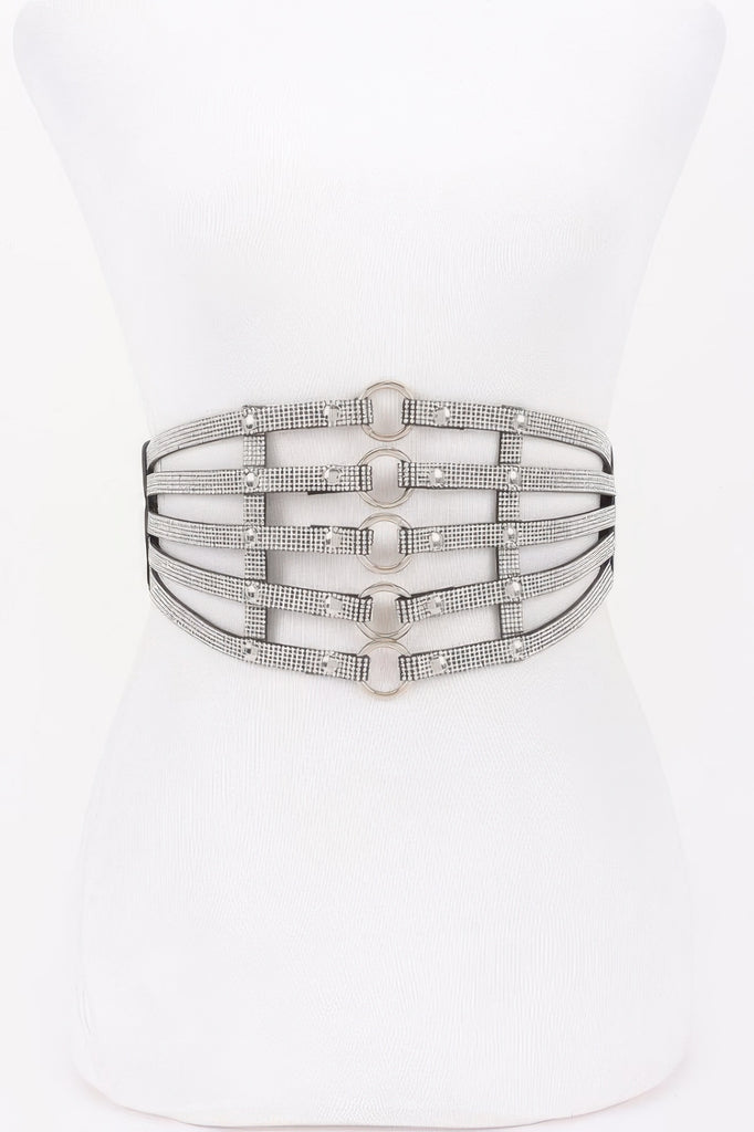 Make a dazzling statement with the Wide Rhinestone Waist Belt, designed to turn heads with its bold sparkle and structured silhouette. Featuring a lattice-style multi-strap design, this belt is richly studded with rhinestones for maximum shine. Metal ring accents connect the straps, creating a captivating geometric look. With its stretch construction and waist-cinching shape, it’s the ultimate accessory for adding drama to any outfit.