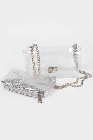 Elevate your accessories with the Luxe Clear Chain Clutch, a stunning mix of glam and functionality. This clear PVC clutch is paired with a dazzling chain and a shiny interior pouch, offering both transparency and a touch of mystery. Perfect for evenings out or upscale events, it complements any outfit with its high-shine detail and contemporary silhouette. Lightweight yet structured, this clutch is where fashion meets function.